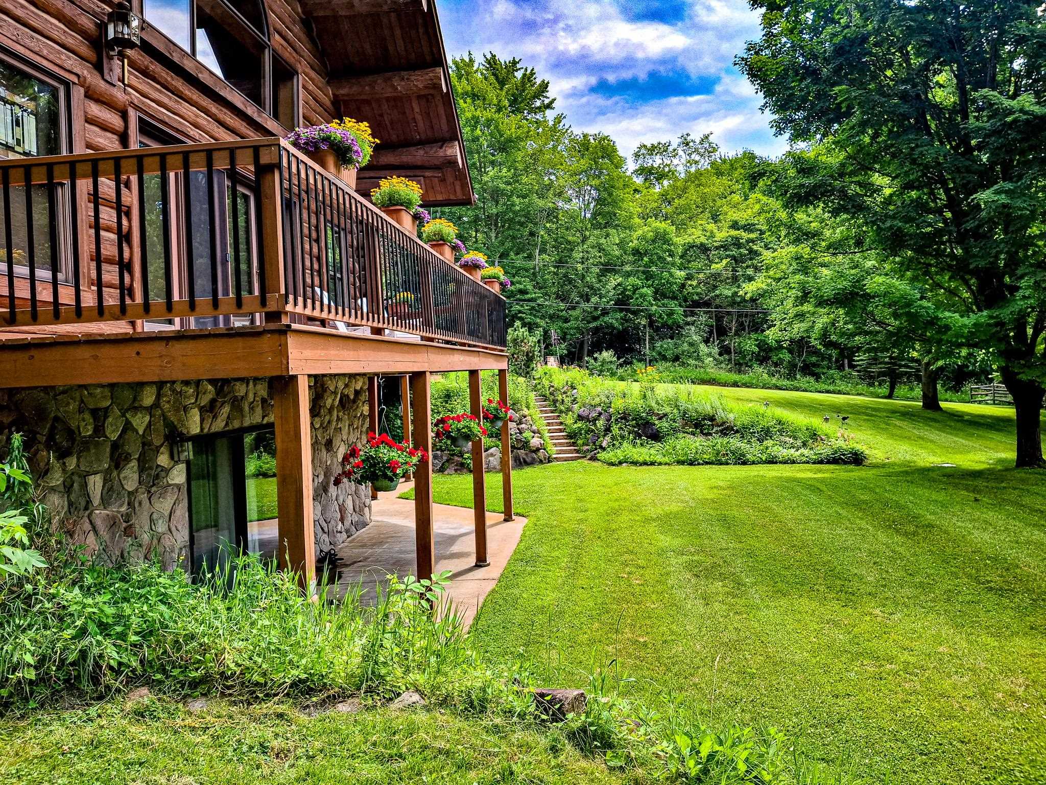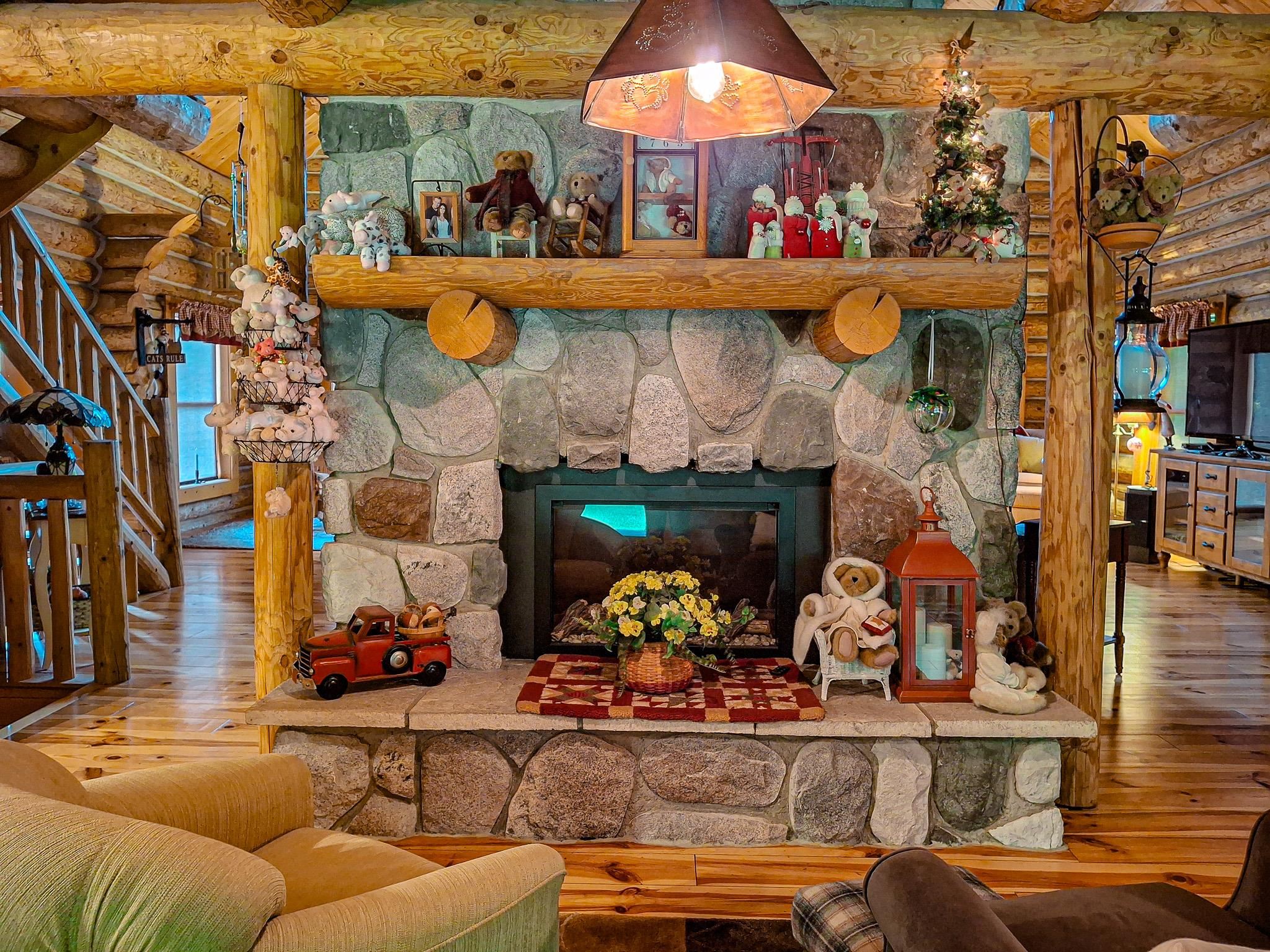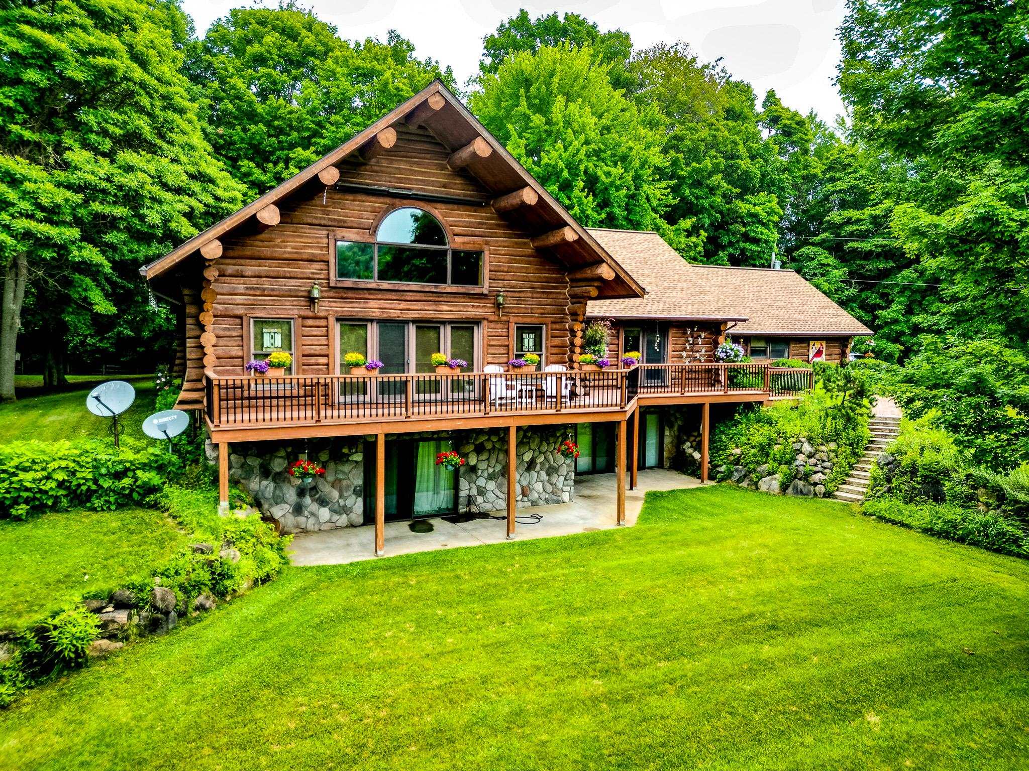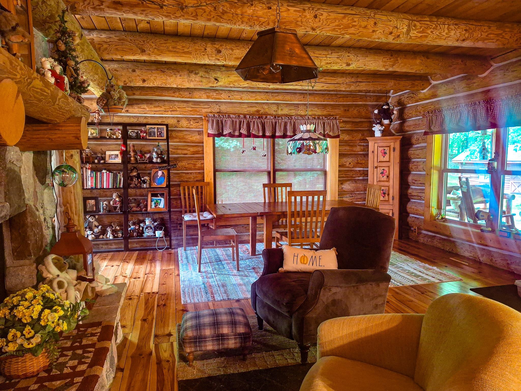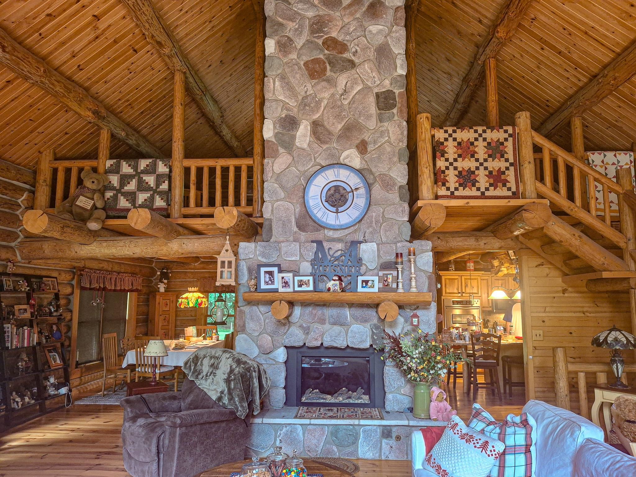 Step into a life less ordinary with this breathtaking custom-built solid log home—where rustic elegance meets serene seclusion, just a short stroll from Timber Ridge Ski Resort and only minutes from the expressway. Tucked at the end of a winding 750-foot paved drive and surrounded by whispering woods, this enchanting retreat offers over 3,500 square feet of warmth, wonder, and timeless charm. The heart of the home beats in the stunning main floor, where imported wide plank heart pine flooring from France glows beneath vaulted ceilings. An executive kitchen is made for gathering, featuring rich granite counters, a 10-foot island, double ovens, gas stove, and stainless steel appliances—all opening to a great room anchored by a massive stone fireplace. Wake each morning in the peaceful main floor primary suite, complete with a full bath, double sinks, and French doors that open to the deck facing the sun-kissed southern landscape. Overlooking it all is a charming 401-square-foot loft, offering views of the northern half of the property—an ideal space for reading, relaxing, or letting your imagination roam. Two additional bedrooms rest quietly on the walk-out lower level, where each has its own sliding doors to the patio and the peaceful outdoors. Downstairs, you’ll also find a second living space with a gas fireplace, a wet bar perfect for entertaining, and a generously sized utility room with abundant storage. Lovingly maintained and thoughtfully upgraded, all major systems have been replaced within the past 13 years, making this home as worry-free as it is welcoming. Comfort is year-round with central heating and air, main floor laundry, underground sprinklers, and thoughtful touches like a hot tub-ready patio and a water spigot for easy outdoor care. Outside, the magic continues with a two-story log barn equipped with 200-amp electric and a frost-free water system—perfect for hobbies, storage, or dreaming big. Here, you won’t see a neighbor—just deer, birdsong, and endless sky. Whether you’re entertaining under the stars, sipping coffee on the porch, or seeking solace in the trees, this is more than a home—it’s a story waiting to be lived.