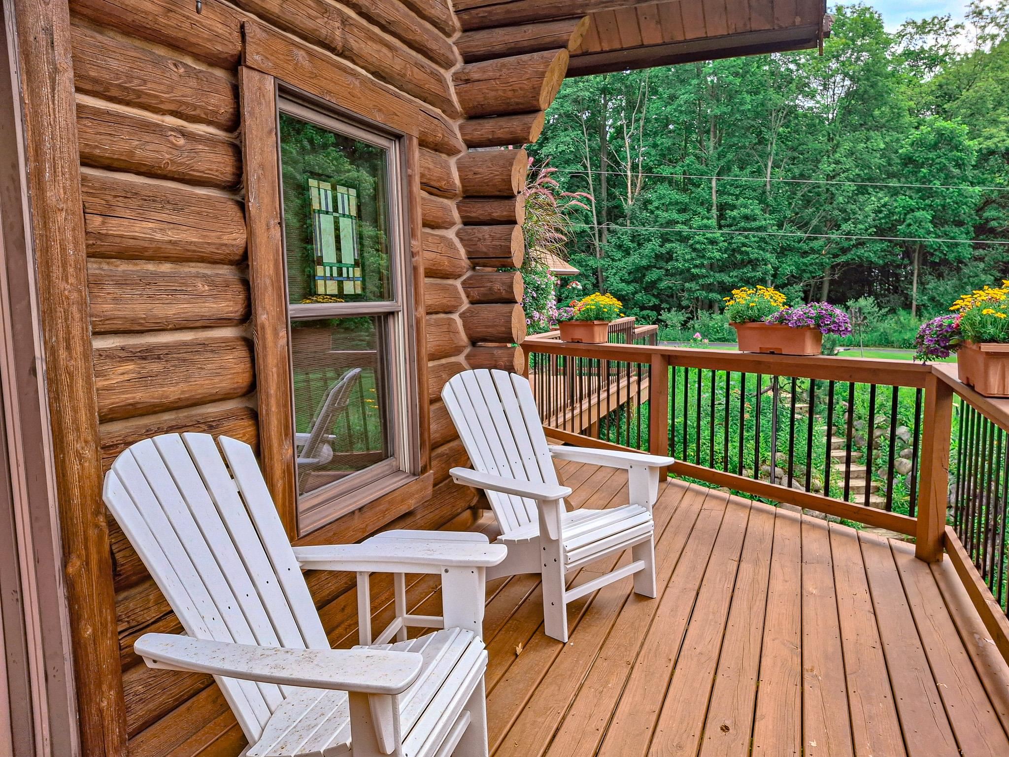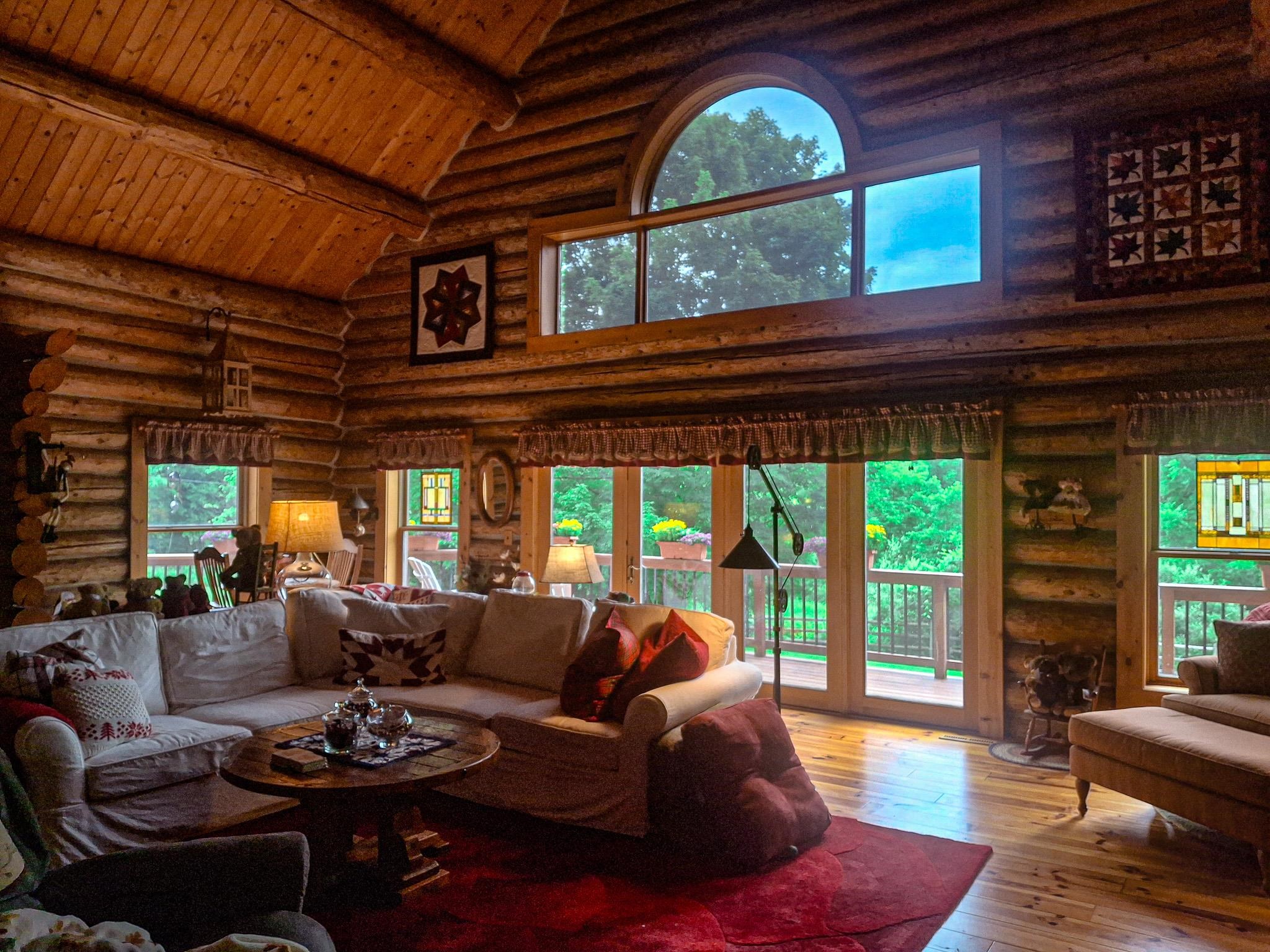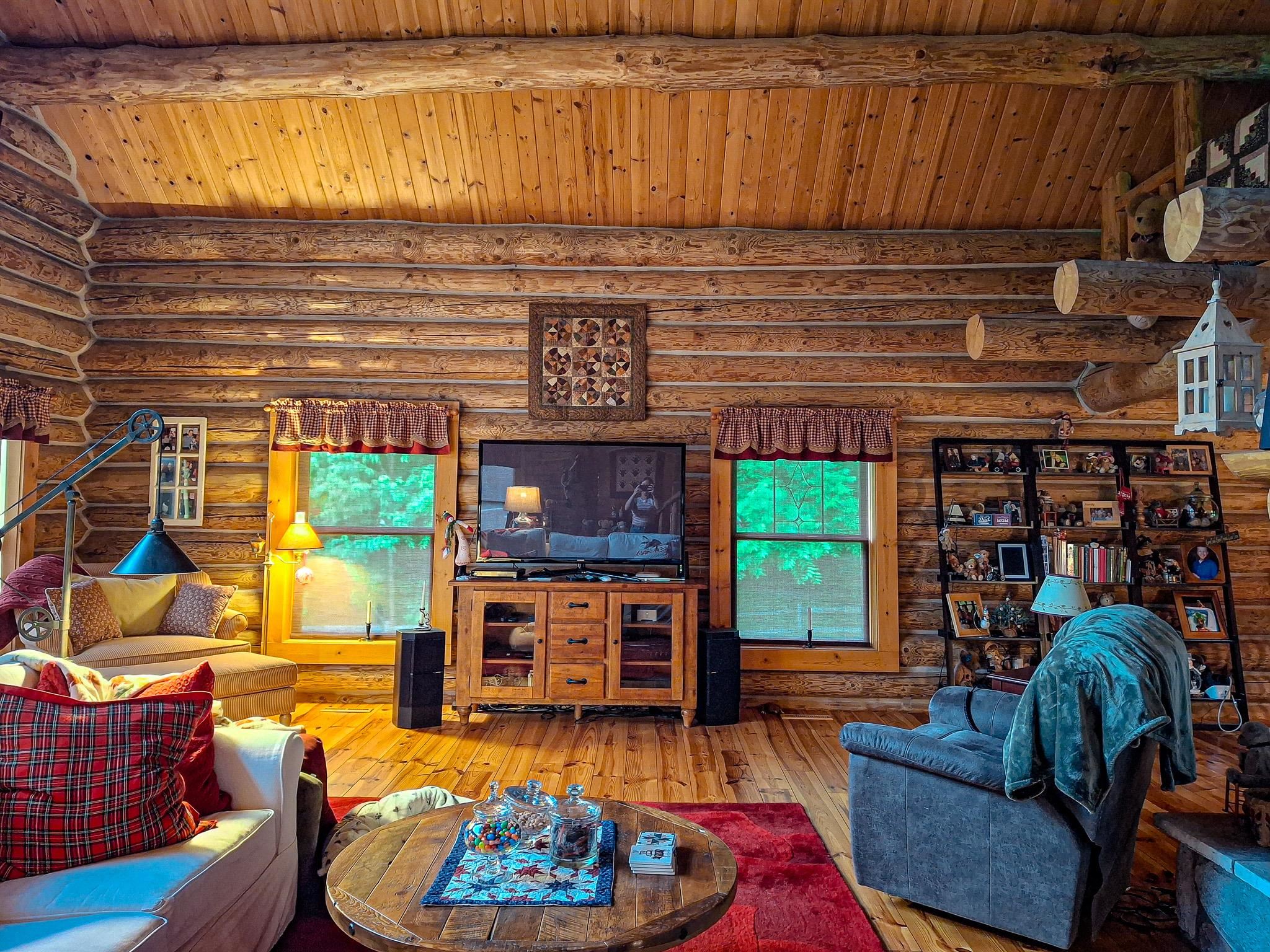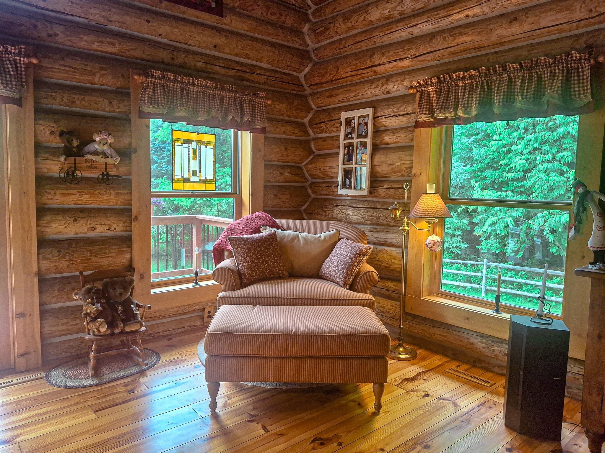 Step into a life less ordinary with this breathtaking custom-built solid log home—where rustic elegance meets serene seclusion, just a short stroll from Timber Ridge Ski Resort and only minutes from the expressway. Tucked at the end of a winding 750-foot paved drive and surrounded by whispering woods, this enchanting retreat offers over 3,500 square feet of warmth, wonder, and timeless charm. The heart of the home beats in the stunning main floor, where imported wide plank heart pine flooring from France glows beneath vaulted ceilings. An executive kitchen is made for gathering, featuring rich granite counters, a 10-foot island, double ovens, gas stove, and stainless steel appliances—all opening to a great room anchored by a massive stone fireplace. Wake each morning in the peaceful main floor primary suite, complete with a full bath, double sinks, and French doors that open to the deck facing the sun-kissed southern landscape. Overlooking it all is a charming 401-square-foot loft, offering views of the northern half of the property—an ideal space for reading, relaxing, or letting your imagination roam. Two additional bedrooms rest quietly on the walk-out lower level, where each has its own sliding doors to the patio and the peaceful outdoors. Downstairs, you’ll also find a second living space with a gas fireplace, a wet bar perfect for entertaining, and a generously sized utility room with abundant storage. Lovingly maintained and thoughtfully upgraded, all major systems have been replaced within the past 13 years, making this home as worry-free as it is welcoming. Comfort is year-round with central heating and air, main floor laundry, underground sprinklers, and thoughtful touches like a hot tub-ready patio and a water spigot for easy outdoor care. Outside, the magic continues with a two-story log barn equipped with 200-amp electric and a frost-free water system—perfect for hobbies, storage, or dreaming big. Here, you won’t see a neighbor—just deer, birdsong, and endless sky. Whether you’re entertaining under the stars, sipping coffee on the porch, or seeking solace in the trees, this is more than a home—it’s a story waiting to be lived.