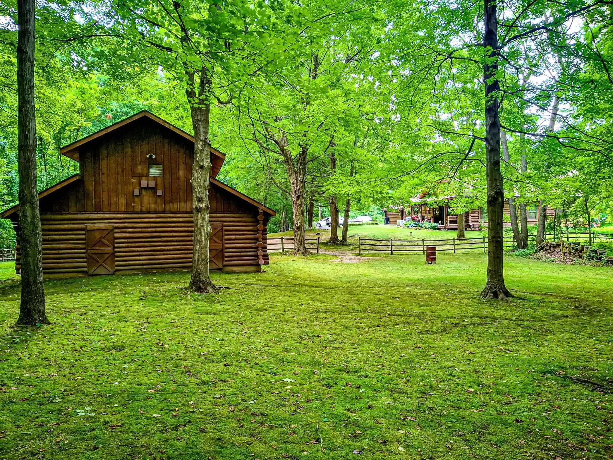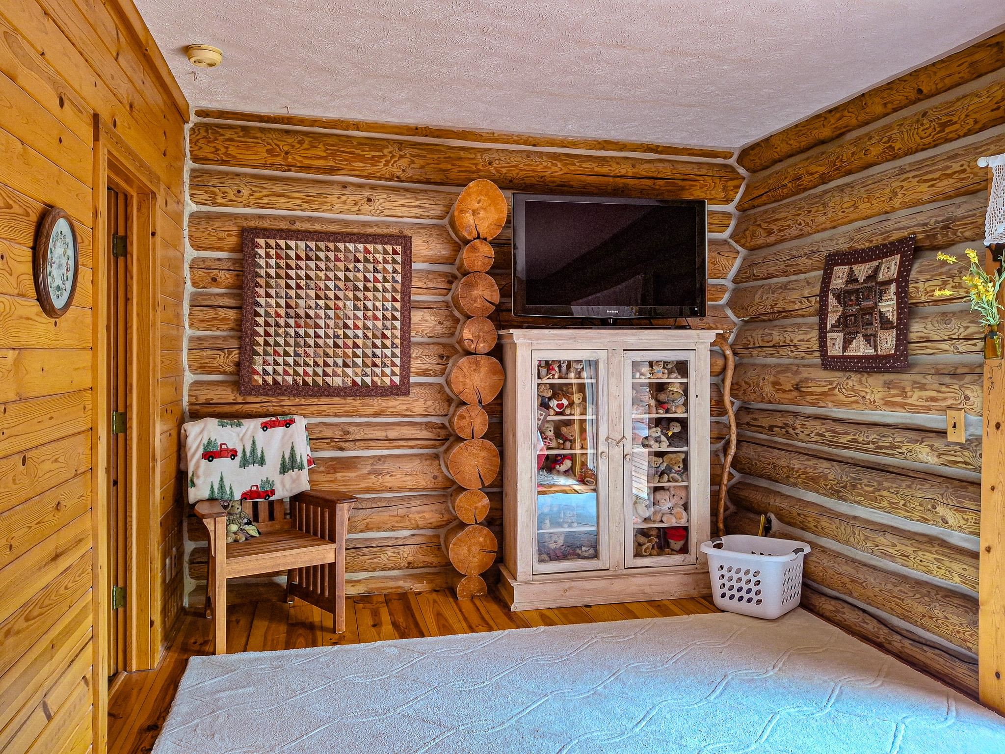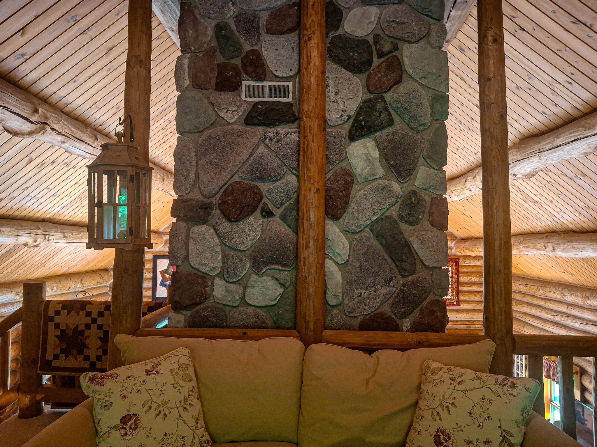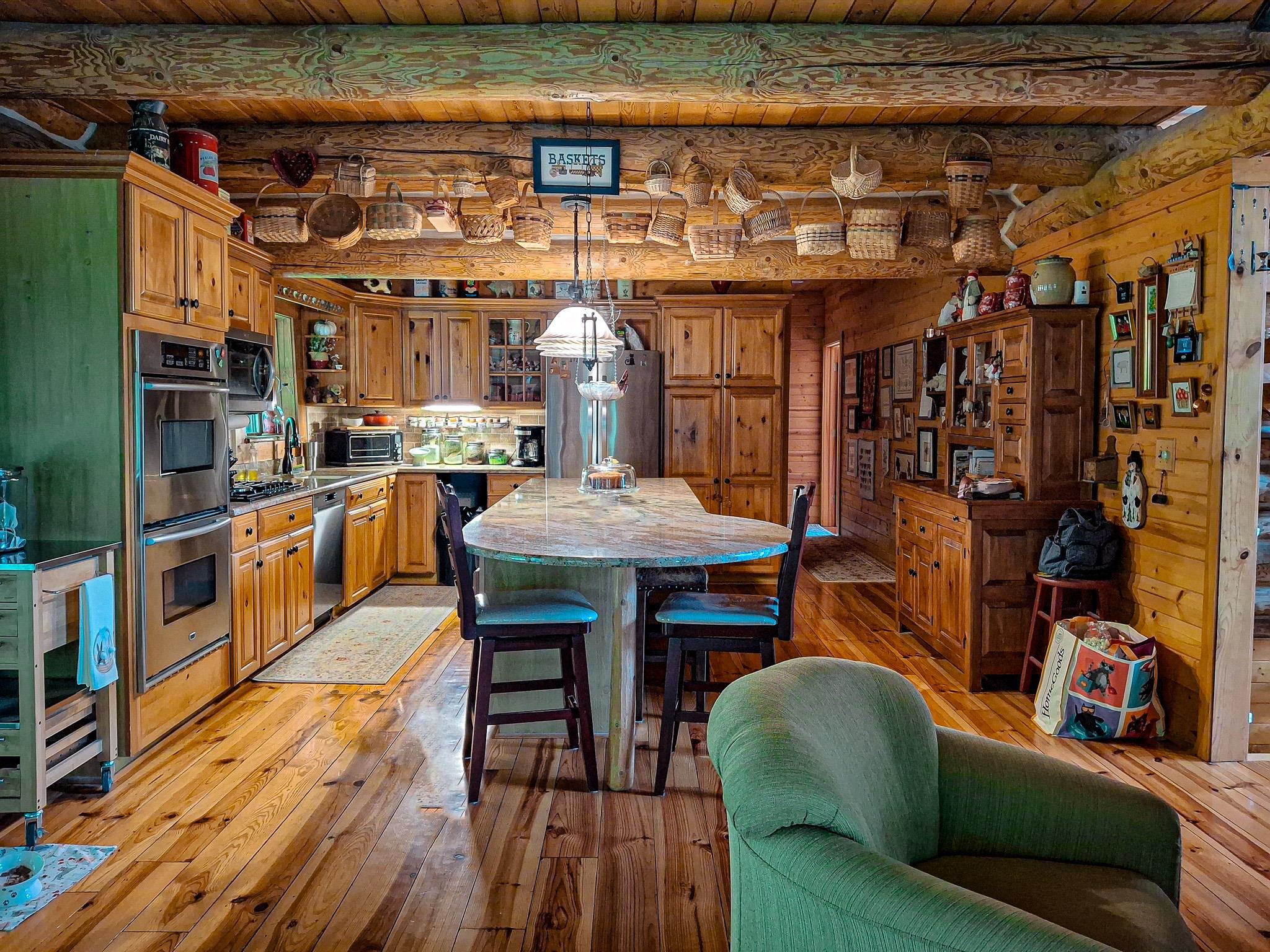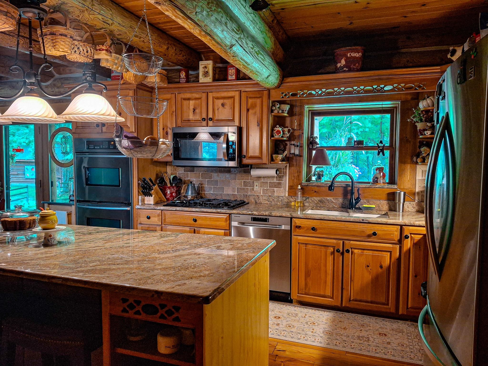 Step into a life less ordinary with this breathtaking custom-built solid log home—where rustic elegance meets serene seclusion, just a short stroll from Timber Ridge Ski Resort and only minutes from the expressway. Tucked at the end of a winding 750-foot paved drive and surrounded by whispering woods, this enchanting retreat offers over 3,500 square feet of warmth, wonder, and timeless charm. The heart of the home beats in the stunning main floor, where imported wide plank heart pine flooring from France glows beneath vaulted ceilings. An executive kitchen is made for gathering, featuring rich granite counters, a 10-foot island, double ovens, gas stove, and stainless steel appliances—all opening to a great room anchored by a massive stone fireplace. Wake each morning in the peaceful main floor primary suite, complete with a full bath, double sinks, and French doors that open to the deck facing the sun-kissed southern landscape. Overlooking it all is a charming 401-square-foot loft, offering views of the northern half of the property—an ideal space for reading, relaxing, or letting your imagination roam. Two additional bedrooms rest quietly on the walk-out lower level, where each has its own sliding doors to the patio and the peaceful outdoors. Downstairs, you’ll also find a second living space with a gas fireplace, a wet bar perfect for entertaining, and a generously sized utility room with abundant storage. Lovingly maintained and thoughtfully upgraded, all major systems have been replaced within the past 13 years, making this home as worry-free as it is welcoming. Comfort is year-round with central heating and air, main floor laundry, underground sprinklers, and thoughtful touches like a hot tub-ready patio and a water spigot for easy outdoor care. Outside, the magic continues with a two-story log barn equipped with 200-amp electric and a frost-free water system—perfect for hobbies, storage, or dreaming big. Here, you won’t see a neighbor—just deer, birdsong, and endless sky. Whether you’re entertaining under the stars, sipping coffee on the porch, or seeking solace in the trees, this is more than a home—it’s a story waiting to be lived.