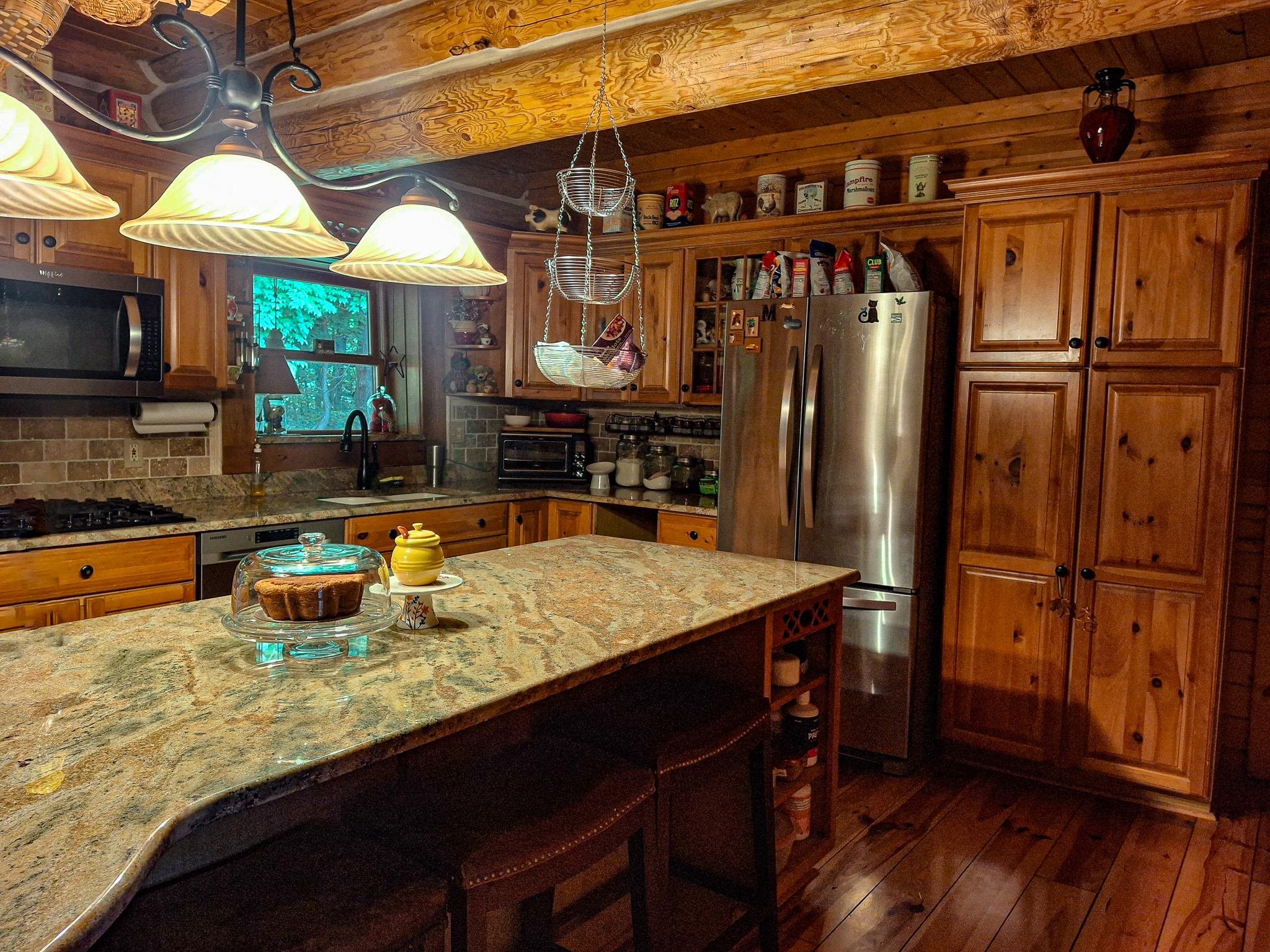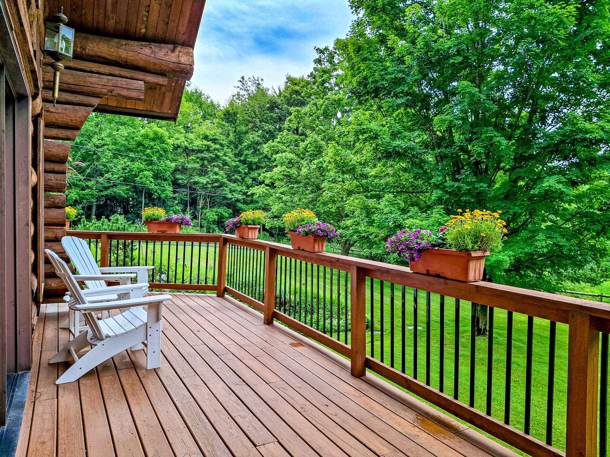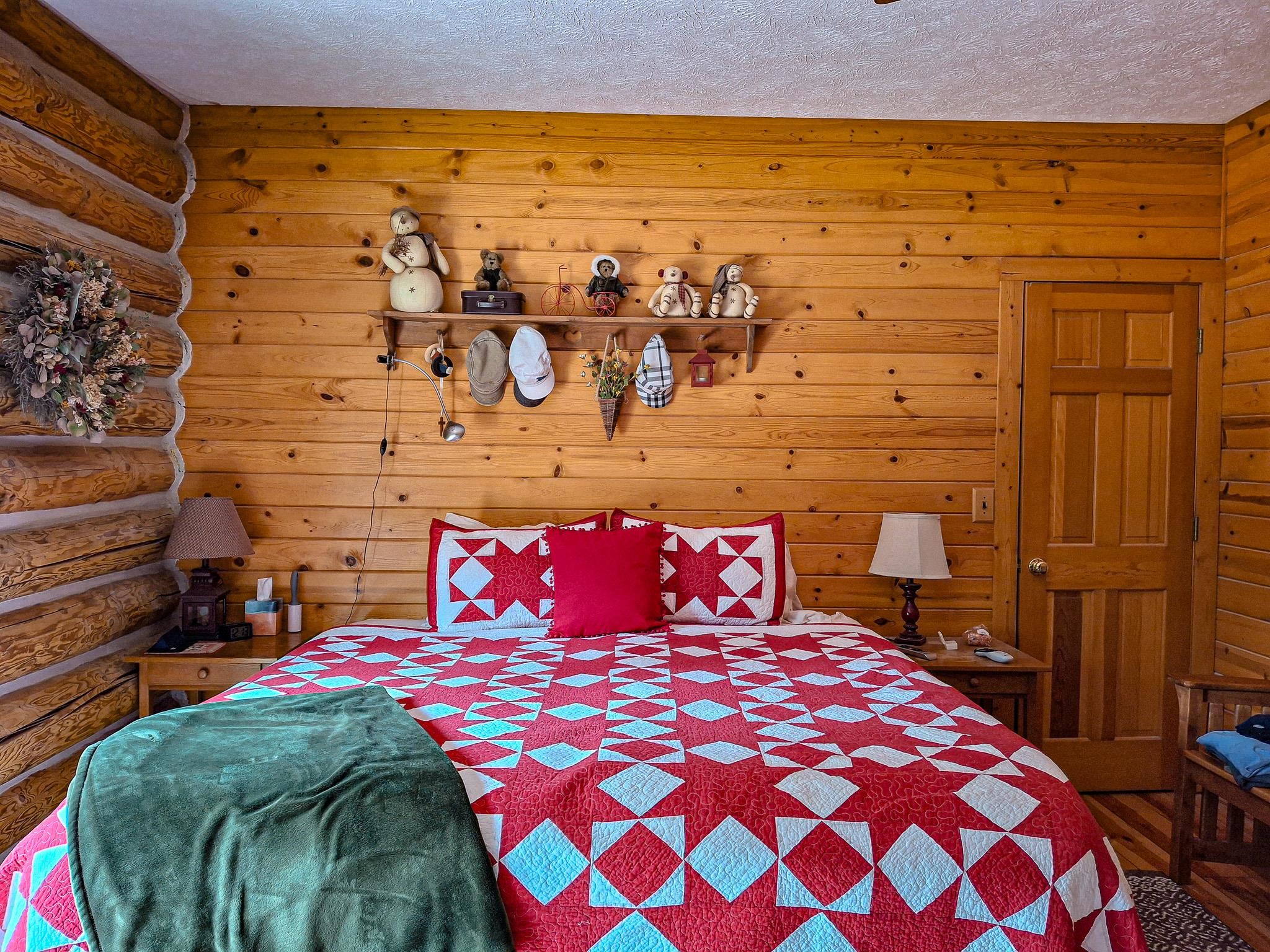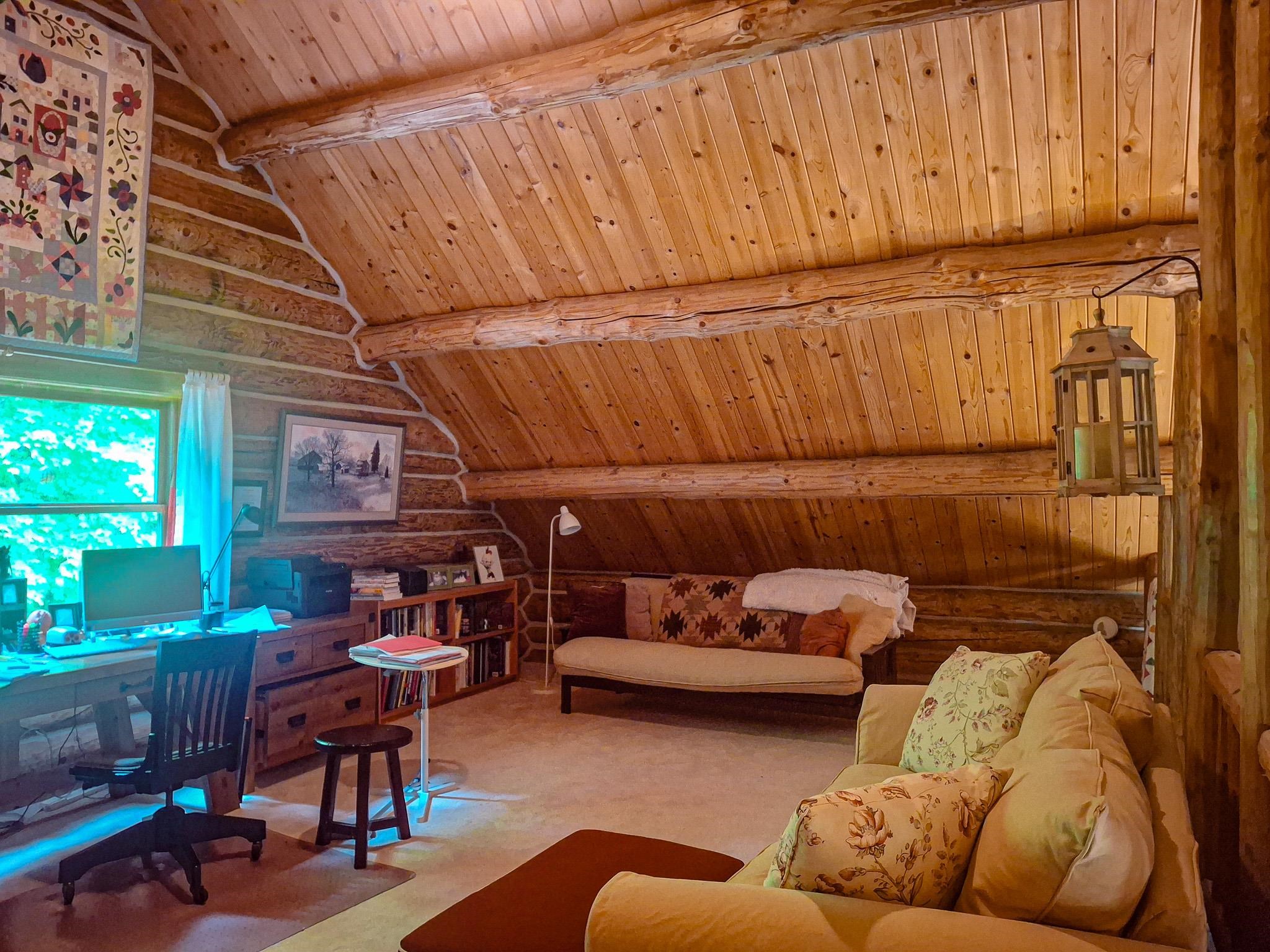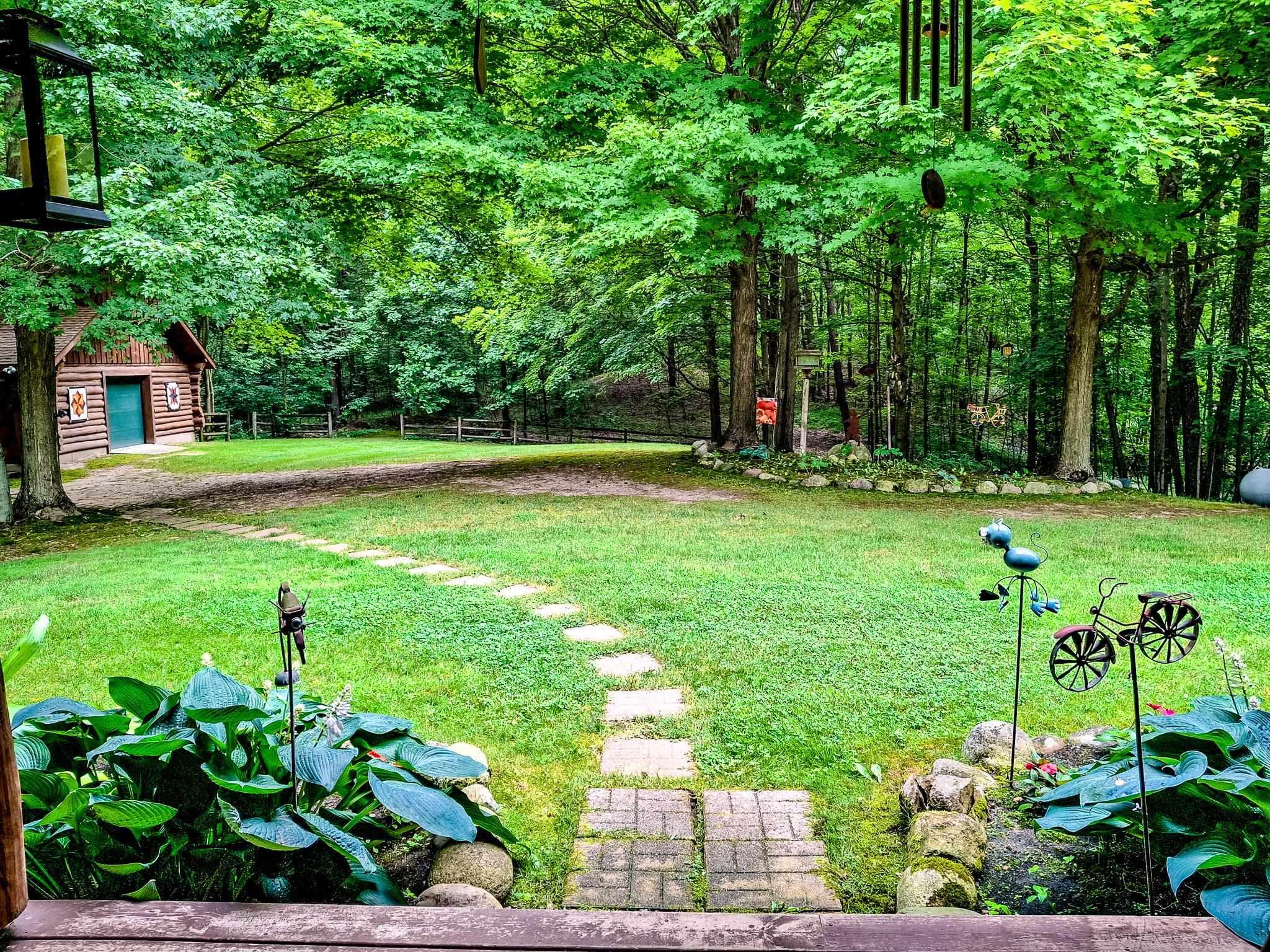 Step into a life less ordinary with this breathtaking custom-built solid log home—where rustic elegance meets serene seclusion, just a short stroll from Timber Ridge Ski Resort and only minutes from the expressway. Tucked at the end of a winding 750-foot paved drive and surrounded by whispering woods, this enchanting retreat offers over 3,500 square feet of warmth, wonder, and timeless charm. The heart of the home beats in the stunning main floor, where imported wide plank heart pine flooring from France glows beneath vaulted ceilings. An executive kitchen is made for gathering, featuring rich granite counters, a 10-foot island, double ovens, gas stove, and stainless steel appliances—all opening to a great room anchored by a massive stone fireplace. Wake each morning in the peaceful main floor primary suite, complete with a full bath, double sinks, and French doors that open to the deck facing the sun-kissed southern landscape. Overlooking it all is a charming 401-square-foot loft, offering views of the northern half of the property—an ideal space for reading, relaxing, or letting your imagination roam. Two additional bedrooms rest quietly on the walk-out lower level, where each has its own sliding doors to the patio and the peaceful outdoors. Downstairs, you’ll also find a second living space with a gas fireplace, a wet bar perfect for entertaining, and a generously sized utility room with abundant storage. Lovingly maintained and thoughtfully upgraded, all major systems have been replaced within the past 13 years, making this home as worry-free as it is welcoming. Comfort is year-round with central heating and air, main floor laundry, underground sprinklers, and thoughtful touches like a hot tub-ready patio and a water spigot for easy outdoor care. Outside, the magic continues with a two-story log barn equipped with 200-amp electric and a frost-free water system—perfect for hobbies, storage, or dreaming big. Here, you won’t see a neighbor—just deer, birdsong, and endless sky. Whether you’re entertaining under the stars, sipping coffee on the porch, or seeking solace in the trees, this is more than a home—it’s a story waiting to be lived.
