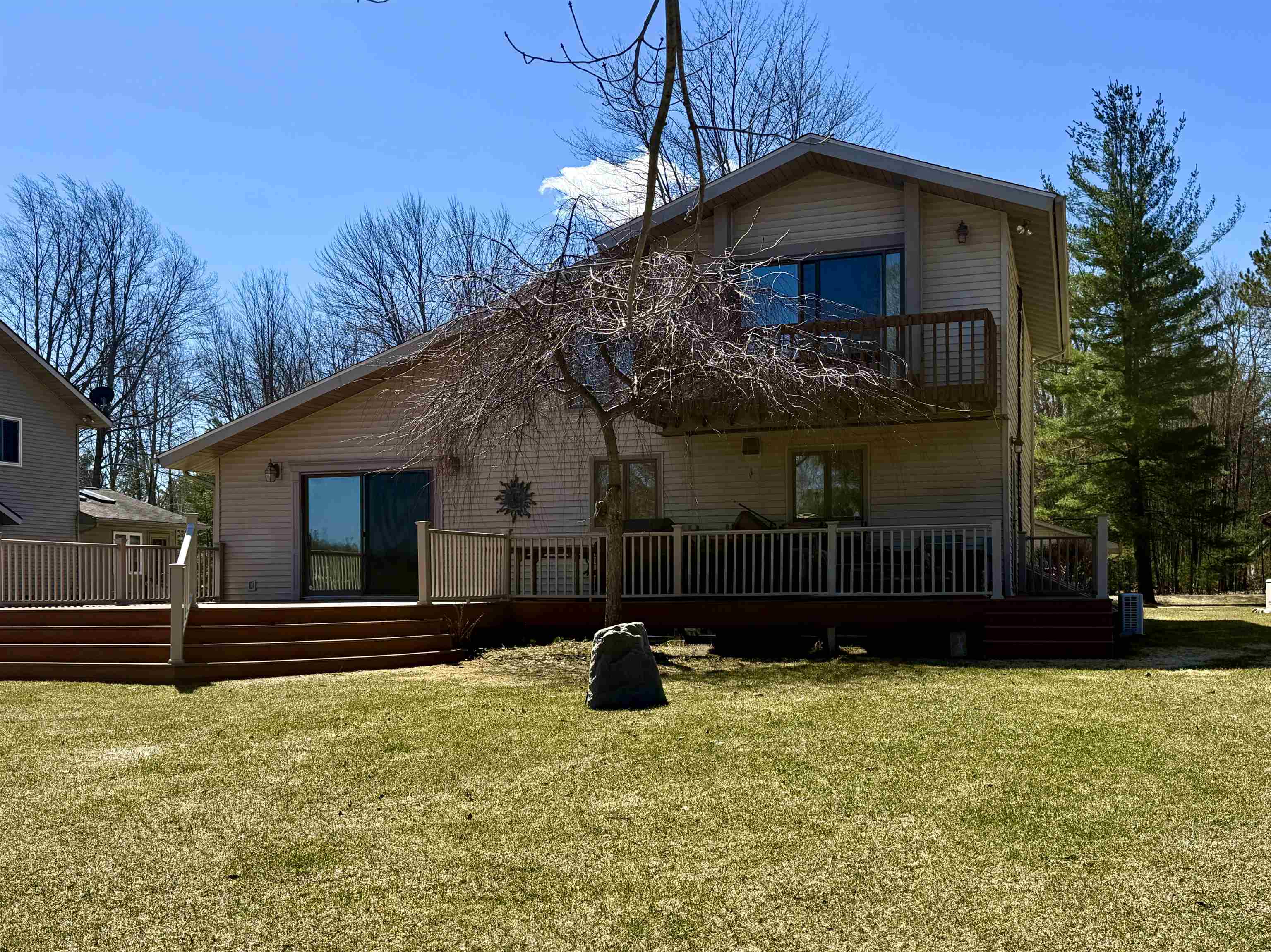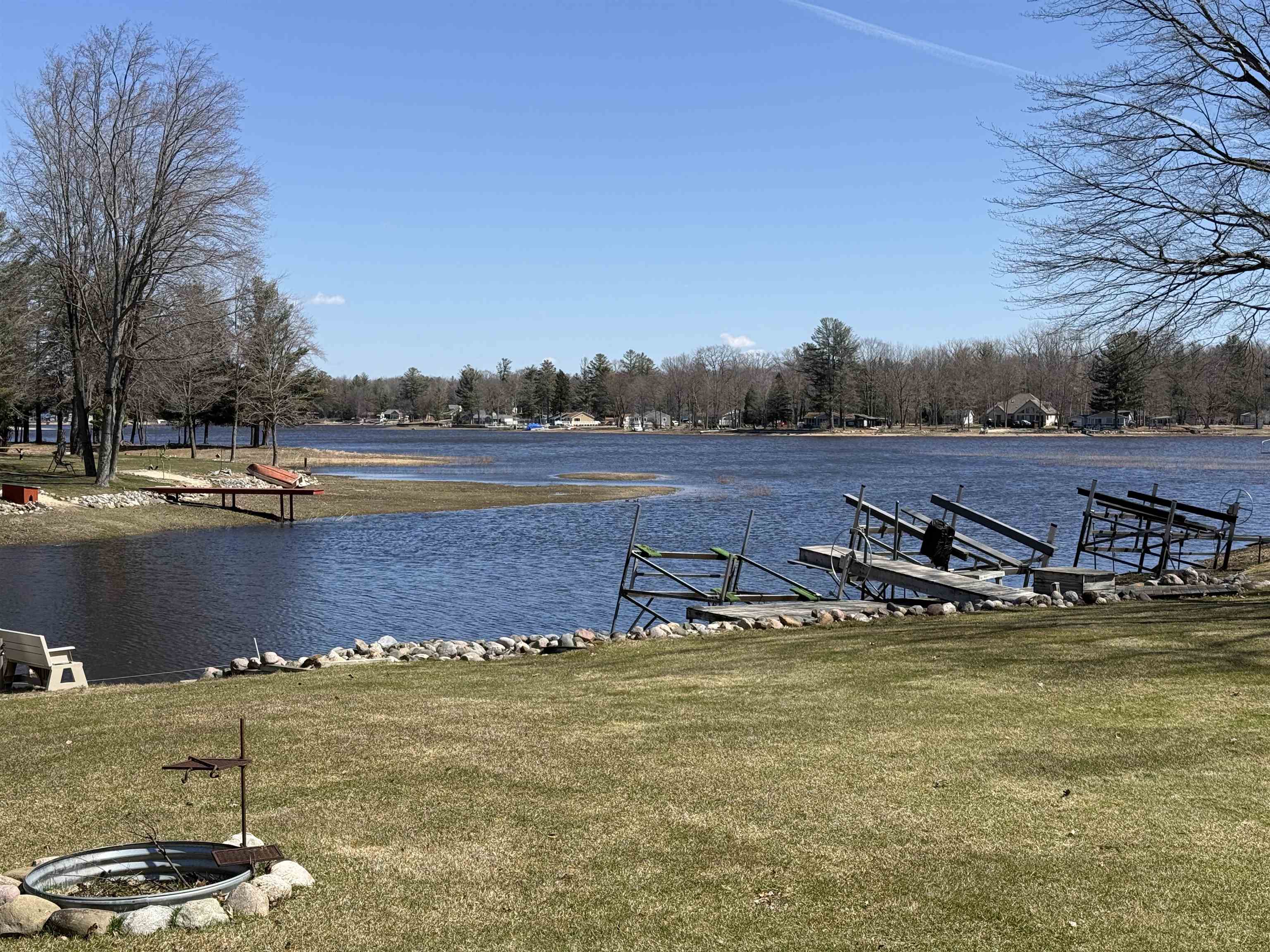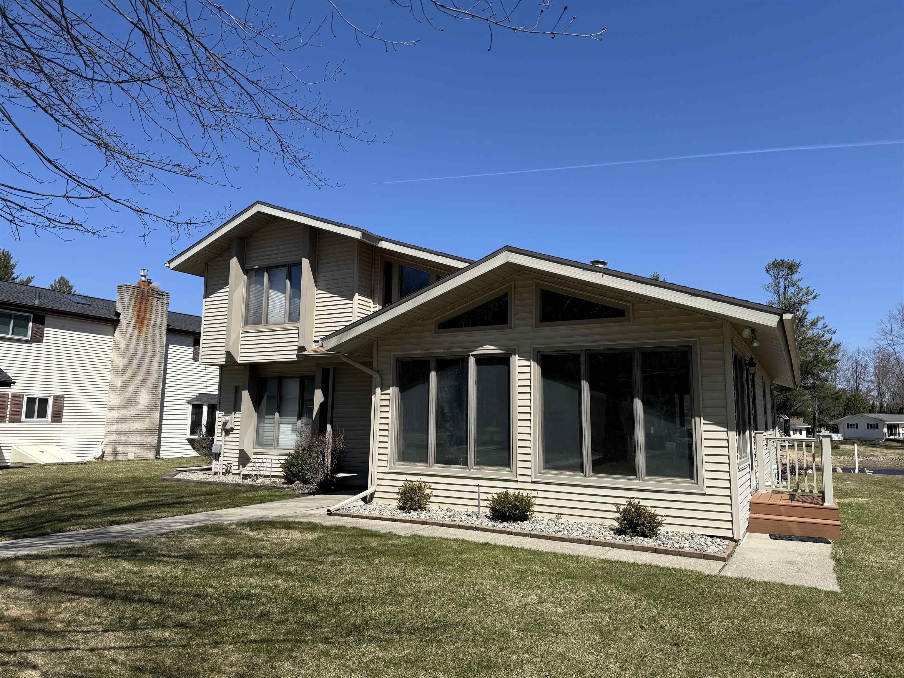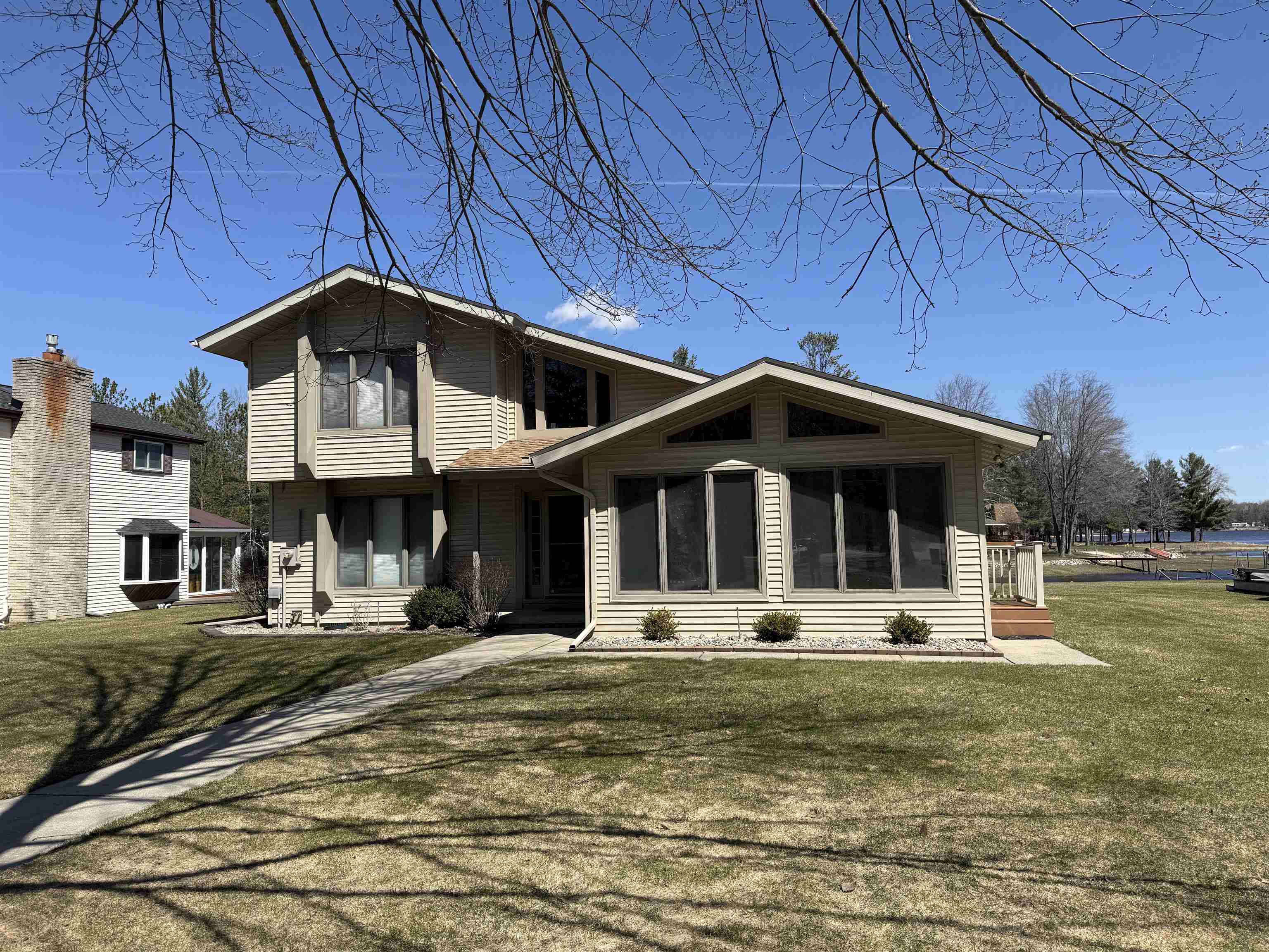 Wonderful Secord Lake Waterfront Home offers 4 bedrooms and 2 full baths, blending modern architectural style with a bright, open floor plan. The spacious great room features a soaring cathedral ceiling and a striking stone fireplace. The kitchen has ample cabinetry with a peninsula bar for casual meals. The dining area is family-sized, with a patio door leading to the maintenance-free composite deck, perfect for entertaining. A beautiful sunroom lined with expansive windows overlooks the backyard, creating a relaxing space to unwind year-round. The primary bedroom includes an attached bath and a private balcony with beautiful lake views. Situated on a large lot along a wide canal, just three homes from the main lake. Enjoy the sand-bottom walk-in shoreline with sparkling clean water, ideal for swimming. This is a peaceful location that still provides quick access to the main lake, offering the best of waterfront living!. Recent updates include a new roof, furnace, new skylights, a 5″ well, and a new stove, providing added peace of mind. Additional features include a sprinkler system and a generous 3-car garage. This home can come fully furnished with the right offer. Don’t hesitate on this spacious waterfront retreat with both privacy and prime lake access. Lake levels are currently lower due to dam construction/updates, but there’s plenty of water for swimming, fishing, and kayaking. Pontoon boats are out cruising the main lake and channels. See the FLTF website for all information regarding the dam assessment. Dam completion expected in 2026. www.four-lakes-taskforce-mi.com.