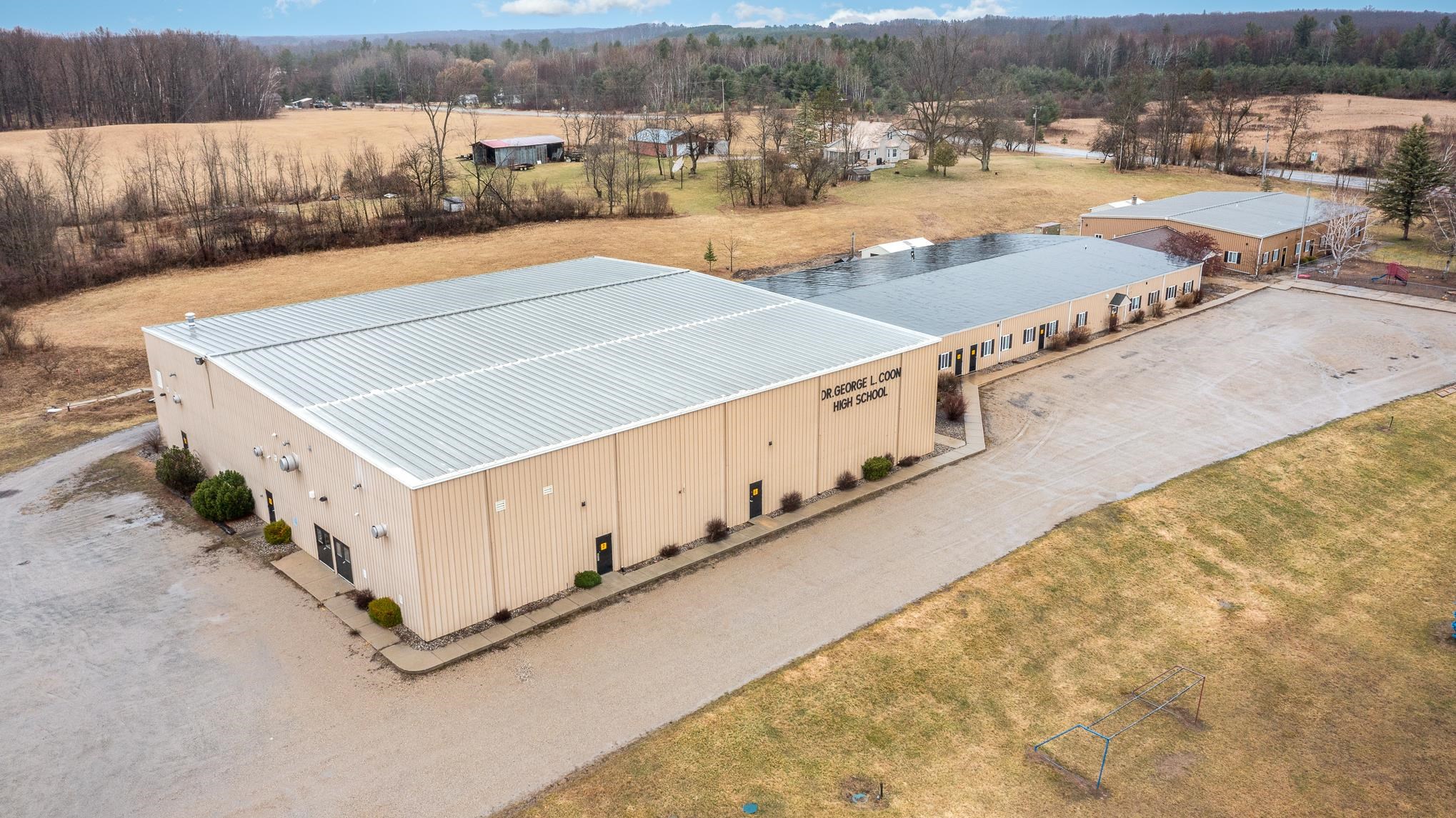 BRING AN OFFER-ALL OFFERS WILL BE CONSIDERED! 35,000 Sq. Ft of STEEL building on 10 acres in Northern Gladwin County! Property was recently a school and can either be zoned as such OR residential as is currently. If interested in commercial zoning contact Gladwin County Building/Zoning department. (they may or may not approve it) School building sits on 10 acres. Property has 2 wells, a 2 tank pump septic system, 2 forced air propane furnaces that heat the GYM building, 2 boiler systems with zoned heating on the remainder buildings that can also be used with an outdoor wood burning stove to cut down on the propane. Building fed by 2 transformers; one line coming into the GYM building and one line coming into the other 3 buildings. (200+ amps each transformer) High speed Spectrum is connected to building and ran throughout. This property has recently been split into two parcels; both are for sale separately/see survey in pictures. * zoned RESIDENTIAL.